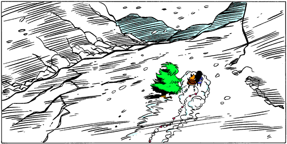 The three friends hurried to get out of sight of the village, so that Rustle could drop his coat and hat and scarf. It was still snowing, harder if anything, but he wanted his limbs free, and open to the light. Despite all the magic within him, he remained a tree, with a tree's needs. More than that, he had a tree's love of peace and quiet, and the events in the village had shaken him more than he cared to admit. Not just the discovery of Nick's disappearance from the minds and memories of the persons who walked there, but the presence of the persons themselves. Where he had sprouted and grown in the north woods, persons appeared only occasionally. The coal miners had stayed the longest, but their grove (their camp) had been farther down the valley, where even their ugly machines could be forgotten for days at a time. The other persons who came simply walked on by, enjoying their sight of Rustle and Bumpyhead and the others. So Rustle's time in the streets of the outpost was the first time he'd been surrounded by so many of those walking, talking creatures, and it had made him think, for the first time since he'd left it, of the quiet and solitude in his birthplace. This desolate glacier was nothing like his woods, but it was much closer to it than the town. Remembering that this had all begun because he was eager to escape his hillside brought a wry shrug to his limbs. He could only hope that his second encounter with Yørgøn would let him, and the world that once had known and loved "Santa Claus," find the peace that they all desired. But first they had to find Yørgøn. "His trail is very, very fresh now," said Chiss, who was forced once again to ride on Mymla's shoulders, but kept jumping down to make certain they continued in the right direction. "We're right behind him now!" "If this snow gets any worse," said Mymla, who bore her burden with only a little complaining, "we could run right over him and never even know it." "Can't you melt the snow away, Chiss?" Rustle asked. It was getting hard to make progress, even for someone with roots spread out in all directions. "I wish I could," Chiss replied, clambering back atop Mymla. "But there's so much of it now, I'd wear myself out." "So instead, you'll wear me out," sighed Mymla. "Can you really keep following his trail if you don't melt the snow?" Rustle asked, growing a little concerned. "You could do it when snow wasn't falling on top of it, but this is turning into a blizzard." Rustle looked around them and saw the same white desolation in all directions. "And even if you can, we'll have to be able to follow the trail back again, to get off this ice." "I thought of that," answered Chiss. "Look what I got in the village." He pulled out a brightly-colored plastic bag, along with a roll of fishing line. "What is it?" asked Rustle. "Popcorn," said Chiss proudly. "What's popcorn?" "What's popcorn?" "He's just a tree," Mymla reminded Chiss gently. "Don't I know it," muttered Chiss. "Well, Rustle, popcorn is what persons use to make strings with at Christmastime -- that and cranberries. I can pop this corn and push it onto this line, to make a string we can lay out as we go. Even if the snow covers it, we'll be able to pull it up and follow it when we need to follow it back." "Cranberries " said Rustle musingly. "I didn't know about them before, but when I think about them now, I do. So I can grow them and make the string go even farther." He began to produce the little red fruits on all his branches, which he lowered so Mymla could pick them off; meanwhile, Chiss held the bag of corn in his hands and began a hearty pop! pop! pop! And so they made their way onward, leaving the colorful markers behind. Even though the snow storm did get worse, Rustle didn't worry any longer. The glacier sloped slightly upward as it led back into the mountains. It was important to make sure each foot or root was placed firmly before trusting any weight to it; a slip could send the slipper sliding a hundred yards. Wherever the ice was split by wind or weather, a pale blue color showed from below -- the color of water, Mymla explained. They were only halfway through the bag of popcorn when they heard a voice calling them on the wind across the wasteland. "Hallooo! Halloooo !" "What's that?" asked Mymla. "I don't know," said Chiss. "But it's not a gnome's voice, that's for certain." The voice called out again, closer this time: "Hallooo, Rustle! Hallooo, Chiss!" "It knows us," said the tree, astonished. "Here in the middle of all this emptiness." "I'm sure it's not Yørgøn," Chiss insisted. "Might as well see who it is." And before they could debate it, he called out an answer: "Here we are! Here!" Almost at once, a huge shape appeared before them, looming suddenly out of the white. In the first moment, Rustle was reminded of their first encounter with Melchior, and in the second, he thought it was the moose again. But in the third, he saw it was another antlered beast. "I'm Regina, a reindeer," said the newcomer, "queen of the ice as my cousin Melchior is king of the forest. He called to me and told me you might come this way; my herd and I have been looking for you." "That's wonderful," said Rustle, "but -- he called to you? I didn't hear anything and it's quite a far distance." Regina lifted her antlers toward the sky. "Just as your kind is connected through the Spirit in the Bark, so is our kind through the Spirit in the Horns. He can send me his thoughts, and I can hear them as clearly as I can hear you." "Good for Melchior!" said Rustle. "I knew he wouldn't forget us. Then you know we're looking for a gnome with a silver bell?" "Not only do I know that," replied Regina, "but I know where he's to be found!" "Really?" gasped Mymla, delighted. "Yes. I sent my herd to scout the glacier, and my daughter has discovered him. She called his location to me not five minutes ago." "That's wonderful!" "Shall I call my herd back together, to meet us there?" "Yes! 