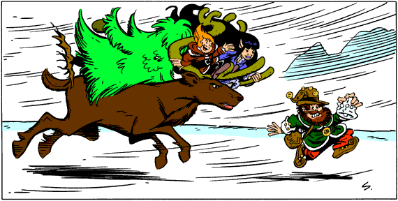 Yørgøn was eyeing the great reindeer suspiciously. Although far into the Northlands, he was nowhere near the North Pole, so this couldn't be one of Nick's reindeer. So why did it seem to be following him? "Shøø!" he snapped grumpily. If it even heard him over the wail of storm winds, it didn't respond. And now -- could it be? -- it seemed to be eyeing him. "Probably just my imagination," he muttered. "Still ." He held the silver bell in his hand and imagined what he could do to that pesky reindeer. Fly him to the South Pole. Cover him with a mountain of snow. Turn him into a tasty bug. Anything he wanted, he could do. Still the Coalman had said the power of the bell wasn't to be wasted -- said Yørgøn had wasted it by making that silly tree walk. Getting rid of reindeer probably qualified as wasting power. Still What was the point of having the bell if you didn't use it? Yørgøn didn't know the answer because he'd never had power; he'd always tried to be of service to those who did. But out here on this glacier, with nobody around except a reindeer -- maybe it was time for him to show what he could do. Maybe it was time to show what this gnome was made of! With an evil grin, he looked back at the reindeer -- -- and found two of the beasts staring back at him now. Yes, definitely staring. It wasn't his imagination. They were looking at him as if they knew who he was and what he'd done. All of a sudden, he forgot about using the bell. He fell back on his instincts, and his instincts told him to RUN AWAY. Even though the bell might be able to help him run, he didn't dare fool around with it. He just turned, hoping the two beasts wouldn't notice -- -- and found three more reindeer watching him! His jaw fallen wide open, snowflakes freezing on his tongue, he spun in a third direction, and there were still more deer. And more were racing up from the white plains beyond. He was surrounded! The racing deer were almost upon him, and now he could see things on the biggest one's back. The snow was in his eyes but it looked like -- "Døøglin haø!!" Perched on each antler were the awful elves, Chiss and Mymla, and holding tight to the deer's broad neck, laid out across its strong back -- was the tree!! "No," he whispered. "No," he said. And "NO!!" he screamed to the unceasing wind. Now there was nothing for it but to use the bell. He raised it to a point before his eyes, just like the Coalman had done (though the Coalman's hand hadn't trembled like this!) -- he got ready to ring it -- then above its silver curve he saw the tree whip one of its branches forward. Something flew from it, straight into his tiny tummy. "Wøøkkh!" he gasped, and dropped the bell, which fell into the soft snow without making a sound. So did Yørgøn. And falling right next to him was the thing that had knocked him over: a huge pine cone! I should have burned him! was the one thing Yørgøn thought before Mymla grabbed the silver bell and Chiss tied him up with their popcorn-and-cranberry string. "We've got it! We've got it!" Mymla shouted. "We've got him!" Chiss added with a triumphant roar. "But where did the Coalman go?" asked Rustle, sliding down Regina's side to land upright in the snow. "H-how did you grow that big a pine cone?" Yørgøn gasped, amazed at what he was seeing. "You gave him the power, you stupid gnome!" laughed Chiss. "Now talk: where's your master?" "Gone," said Yørgøn, head swiveling from one to the other. They might have him, but they hadn't really won. "He's gone and he's destroyed your master, so you're too late." Suddenly he burst out laughing. "Really too late, because he's gone to the past!" "Talk," growled Mymla, and Rustle looked at her curiously; she'd never sounded so fierce before. "I heard him," said the gnome. "He used the bell to go to the past and stop Nick from ever becoming Santa Claus." "The town of Myra in the year 282 -- in ancient Turkey, when it was called Lycia, and Nick was called Nikola," muttered Chiss. "That's right. That's what he said." "I've heard Nick talk about it many times, on the long summer days when we take a break from making toys," said Chiss excitedly. "That was where he learned to live forever." "He's not living forever now!" sneered Yørgøn, getting a little of his bluster back as it sunk into him: they hadn't won. Which meant he hadn't really lost. "But wait -- there's still a chance!" It was Rustle, suddenly speaking up. "We can use the bell ourselves -- go after the Coalman and stop him! Don't you see, if he can travel in time, so can we, and we can go back before he stops Nick!" Mymla shook her head, and Chiss kicked at the snow disgustedly. "It's a good idea, Rustle," she said, "but it won't work. Elves -- and gnomes -- all of us fairy creatures are part of the time we live in. We're part of the environment -- part of what makes 'now' now." "We can't travel in time like persons can," said Chiss. "But why couldn't I do it?" asked Rustle. "You?" "I'm not an elf or a gnome. I can do it!" "But you don't even know Nick," answered Chiss. "You hardly even know what he does. And even though you're full of magic, you're not a sorcerer; you're no match for the Coalman." "Maybe not," said Rustle. "But what other choice do we have? And as for knowing Nick and what he does -- I know you, and I can tell what kind of master you'd work for. I know Yørgøn, and I know what kind of master he'd work for. So I know which one deserves to win this war between them." "I think he's right," said Regina. "My cousins who live with Nicholas and pull his sleigh every Christmas Eve have called to me of their pride and their joy at helping in his work. My cousin Melchior has called to me of the Spirit in the Bark. If there's any chance to save Nick, it must be taken, and if there's anyone to take it, it's Rustle." "Now wait -- " Yørgøn began. "Be quiet, you!" said Rustle, surprising himself by sounding as fierce as Mymla had. "Give me the bell, Mymla." With a sort of sile