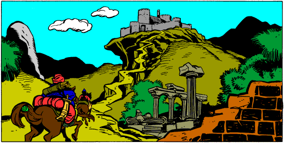 The bandits gaped at the spot where the sorcerer had stood. Gerondimar rushed forward and waved his hands in the air there, but encountered nothing. The other bandits glared around themselves, trying to find the man hiding in some corner or shadow, but saw nothing. At last their leader spoke. "Wizards! We've seen our share of wonder-workers, lads, coming and going on their journeys to the ends of the empire -- and we've helped ourselves to their mystic treasures -- but that one was the grandest. And he had no treasure at all." "What if it's some sort of trick?" asked the guard with the wheeze. "He's seen the inside of our fortress now -- what's to keep him from returning to steal from us?" "The same thing that keeps everyone at bay," said Gerondimar. "The treasure room is hidden, and far more cleverly than the good bishop's. No outsider will ever find it." He waved them away, changing the subject. "You there, guard -- ride down to the village and see what that fool constable is doing about our theft. Since you weren't involved in it, you'll run no risk. You others, go find your hiding places in the pass before the caravan from Patara arrives. I'll join you when the sun's a hand's-breadth above the sea." "We just finished a long ride!" protested one of the thieves. Gerondimar smiled, a smile nearly as ghastly as the Coalman's. "Obey -- or die!" he hissed. With more than a little muttering, the thieves remounted their horses, and clattered back out of the fortress. Far below them, they could see the little town of Myra, and the empty plains between it and their mountains. "I suppose he must have his way," said one, as they turned up the trail to the pass. "He has done well by us." But not as well as he's done by me -- and Bishop Nikola, thought Rustle. For he had brushed from one horse's tail to another, and rode now back to town.