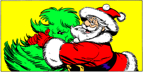 Nick's and Rustle's eyes were locked on each other. The tree was seeing for the first time the "Santa Claus" known to persons everywhere, and Bishop Nikola was seeing his "magic tree" for the first time in seventeen centuries. Nick had aged enough to turn his beard and eyebrows white, but his cheeks were still ruddy, his eyes even more latticed with laugh-lines. Just as the elves had said, instead of his red robes he wore a red suit, with a similar cap, all trimmed with white fur. His boots had become unadorned black leather, better suited to this land of ice and snow. He was smoking a pipe, or at least clenching it in his teeth; Rustle saw (with a small thrill of relief) that it wasn't actually lit. But one thing about Bishop Nikola had not changed in the slightest: he was fat! "It really is you!" Rustle gasped. "You're really here!" "That I am, that I am," laughed Santa Claus. "And you -- " Impulsively, he stepped forward and threw his arms around Rustle in a heart-felt hug, laughing all the time. Rustle started to pull away in embarrassment -- but then he held his ground and hugged Nick back the best he could. I hugged him once, to save him from Gerondimar, he thought. I can hug him now. When they finally let each other go, Nick said, "I always knew I'd see you again. You couldn't have given me the gift of time if you didn't already have it yourself. Not one century -- not five or ten or seventeen -- could keep me from believing that one Christmas, we would meet once more. By all my reindeer, it's good to hear your whispering tree-voice again!" Still somewhat flustered, Rustle said, "I guess there was no way to know how long it would be, since trees look the same in any time." "That's right," grinned Nick. "People down below -- that is, everyone who lives below the North Pole -- " "Meaning everyone in the world," interjected Mymla. "Yes, everyone in the world changes their style of clothing over time. If you'd been a human wizard, I would've noticed when the clothing you wore in the third century came into being in a later century, but since you wore nothing but olives, I was left to wait for the answer. Oh, was I ever excited when I heard Chiss and Mymla had found you at last!" "You needn't think of me as a 'wizard,'" Rustle protested. "I'm only a tree, who happened to be in the path of the gnome who stole your silver bell." "No, Rustle!" boomed Nick. "Don't you see it? You didn't just 'happen to be' in Yørgøn's path. It was destiny that brought him to you, because you'd already held the magic, 1700 years before!" Rustle's bark furrowed. "But I only sprouted a few years ago." "Nevertheless, the way it's worked out, you were also alive in the distant past. Your life now can be seen as your second existence, not your first -- you planted the seeds of your future when you went into the past. But I can see that this is a difficult idea -- as it would be for anyone who hasn't altered time on a regular basis, as I have -- and Christmas is a time for all difficulties to be put aside. So banish it from your mind, my friend, and just accept what's here and now. Please, come into my workshop! Come see what I've become!" They entered through the cheerful door -- even Melchior and Regina came along. But once inside Rustle stopped once more, this time in something more than amazement -- something more like awe. Before them was a short set of stairs, leading down to a room that extended as far as Rustle could see, ahead of him and to the sides. And everywhere in that endless underground chamber, he saw elves: fire-elves and water-elves and other-elves, dressed in every color under the Northern Lights. Some elves were taller than others, some fatter, some older, but all had the characteristic large pointed ears and enormous eyes, wide hips, thin legs and oversized hands and feet. They were sitting at long, wide tables, one after the other, and working on every sort of thing Rustle could imagine, and everything else he couldn't. There were airplanes, boomerangs, computers, dolls, easels, footballs, gyroscopes, helicopters, ice skates, jack-in-the-boxes, kites, lariats, magic wands, necklaces, ornaments, piñatas, quartz watches, rocket ships, sweaters, tricycles, unicycles, videos, western cowboy hats, xylophones, yo-yos, and zoo animal babies. There were zithers, yearly diaries, X-Caliber action figures, walkie-talkies, violins, UFOs, tents, sleds, race cars, quivers, periscopes, O-gauge trains, Nutcrackers, marshmallow pies, licorice whips, kaleidoscopes, jigsaw puzzles, illustrated storybooks, hobby horses, games, flags, earrings, dinosaurs, cards, basketballs, and ant farms. And there was a continuous hubbub of chatter and laughter and calls for more paint and more glue, but the hall was so heavily decked with rolls of colorful paper, ribbons, fat balls of string and sprigs of shiny holly that the noise was kept within comfortable limits. Up and down the aisles between the tables ran the youngest elves, taking completed things and loading them into carts, higher and higher and higher, until Rustle was certain everything would tip over into a mountainous mess. But the little elves never lost a single thing as they trundled their carts to a wide circle in the middle distance, where they ran up a spiral ramp (and how could they possibly not tip their prizes out now?). Only when they reached the top did they lift the backs of their carts and tumble the toys into a funnel-like chute. "Everything is sorted for delivery there," said Chiss. "All the toys going to one street are put into one bag, then all the bags for the neighborhood are put into a bigger bag, then all the neighborhood bags are put into town bags, then town bags in state bags -- " "Province bags!" yelled a passing elf, good-naturedly. " -- then those bags go into country bags, then continent bags -- " Rustle turned to Nick. "I don't know what a continent is, but if it's bigger than all the things before it -- " Nick just laughed -- he