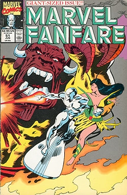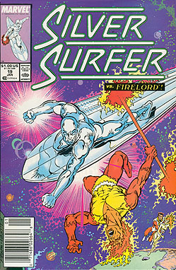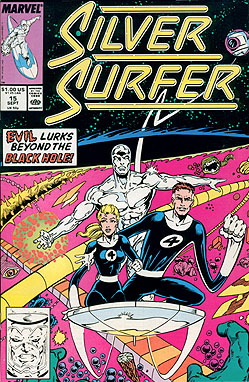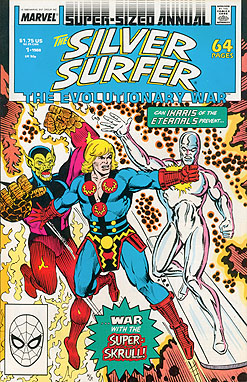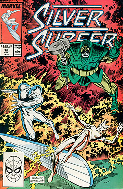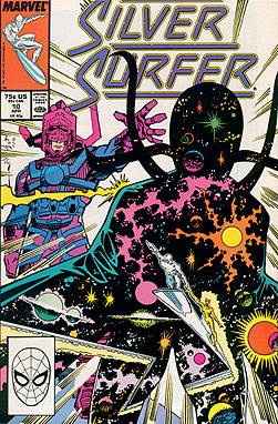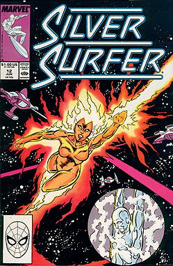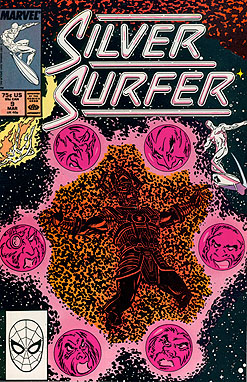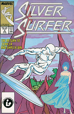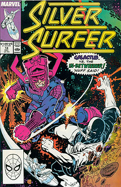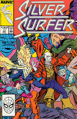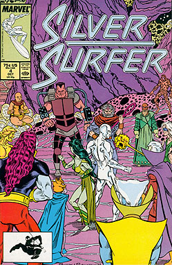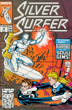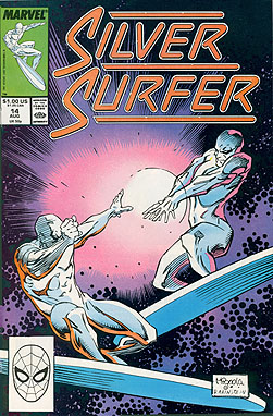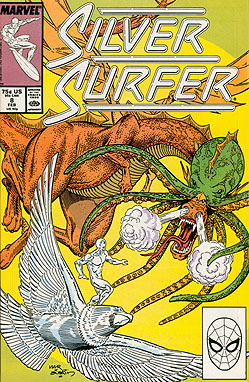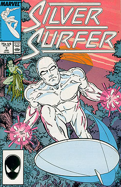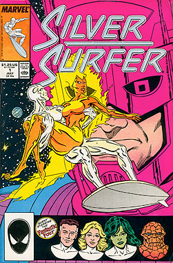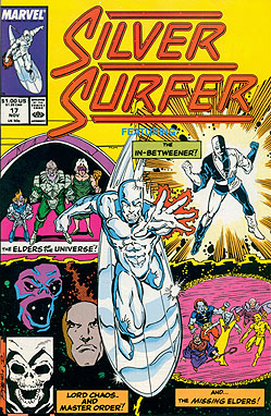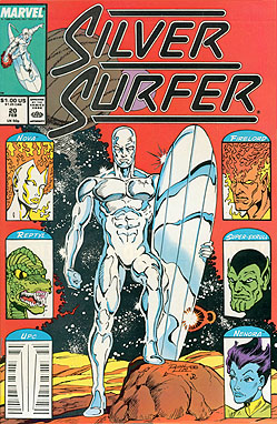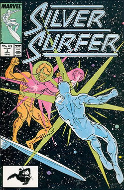 It began when Editor-in-Chief Jim Shooter asked me to do a SURFER book. I was pleased to be asked, but remembered that the character had been reserved for Editor Emeritus Stan Lee. Jim was clear in his response: the current Powers That Be had decided the Surfer could make the company money, and should. So, if I were going to do the Surfer, I wanted to get him off Earth. He had been trapped here, denied the vastness of space, since his first epic in FF #48-50, and I felt that situation had long outlived its interest. For one thing, despite everyone's affection for the character and some good people giving it their all, he had never sold. The Surfer seemed like he ought to be great, but he wasn't. Nevertheless, I was told he had to stay on Earth. So I wrote a #1 issue, and plotted two more, under that restriction. But I kept bugging Jim, and all of a sudden, for whatever reason, I got my way. The Surfer could fly free. That first issue was shelved and I started over with a new #1. That "earthbound" first issue later appeared as an "imaginary story" in MARVEL FANFARE [see below]. But we were off to the races at last. I got the Surfer into the grandeur of space, and for the first time ever, he sold. I also got him a woman who was equipped to share his life. In the earthbound #1, and then alternatively in the spaceborne #3, he met Mantis, the Celestial Madonna. He met all the great beings of the Marvel Universe, and I mean Universe. Galactus, Eternity, the Elders, the In-Betweener, the Supreme Intelligence, the Soul Gems... The Silver Surfer was finally where he belonged! And following the path of the Dr Strange and Batman live-action films, the NightMan television series, and Batman: The Animated Series/The Adventures of Batman & Robin, The Silver Surfer animated series by Sabon was generated from my stories (and from my DR STRANGE!). |