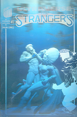 A story about Yrial before the Jumpstart appeared in ULTRAVERSE PREMIERE. 1: Included at no extra charge is the origin of The Night Man, before anyone knew that it was. The cover shown is the special limited edition with silver lettering and a stamp; there was a more conventional one as well. 12: Very nice of Malibu to give all of us a double-cover at the end of our first year. (See Mike Barr's MANTRA, guesting the Strangers, on the next page.) And thank goodness we got a better logo! Hologram: I am frankly amazed this can be scanned - but here it is! This is a seriously limited edition of #1. |